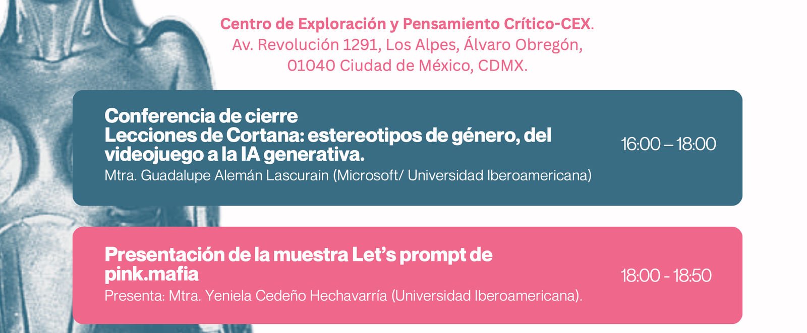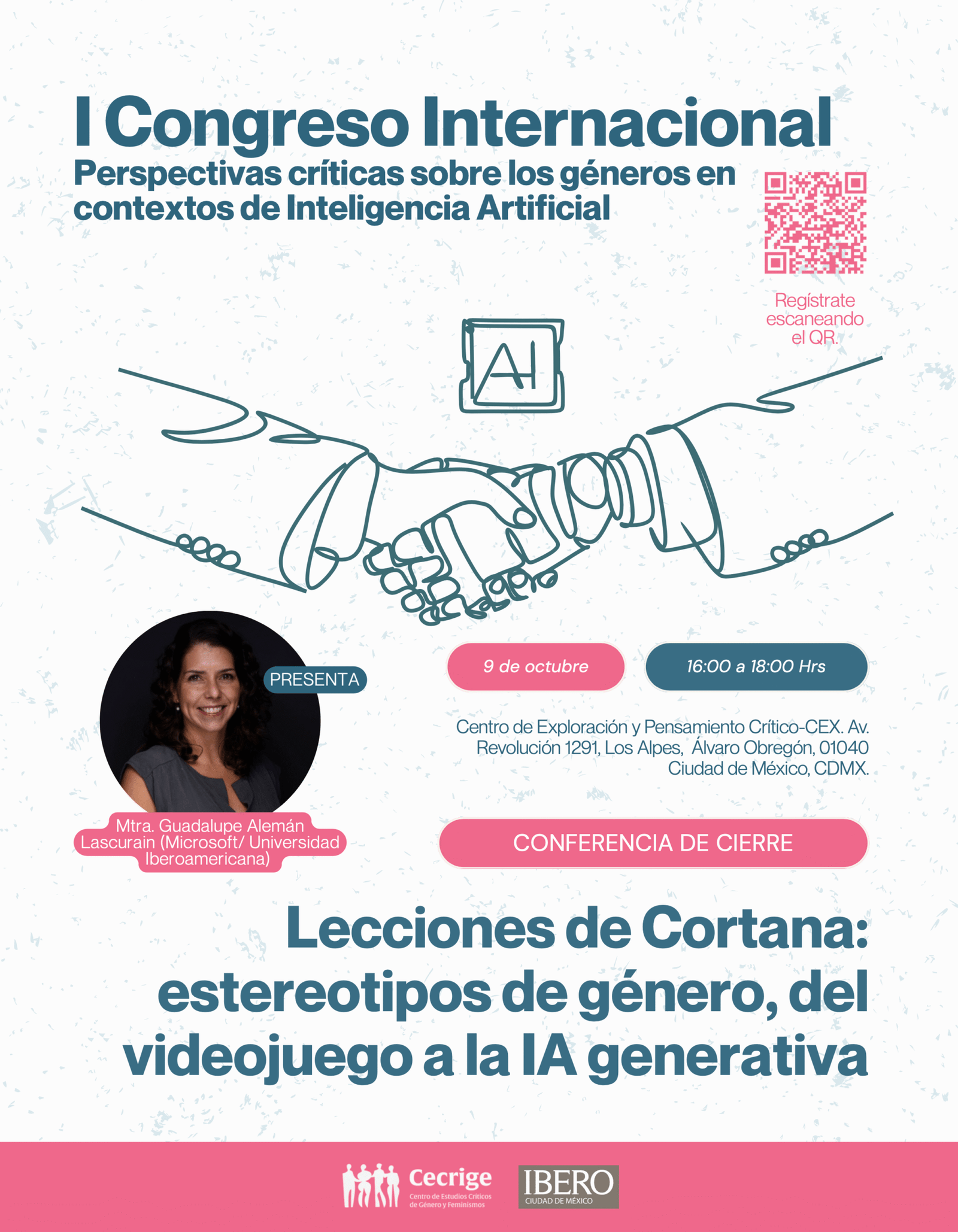 No te pierdas esta oportunidad de análisis y debate con expertos de primer nivel, incluyendo la conferencia “Lecciones de Cortana: estereotipos de género, del videojuego a la IA generativa” impartida por la Mtra. Guadalupe Alemán Lascurain (Microsoft/Universidad Iberoamericana).