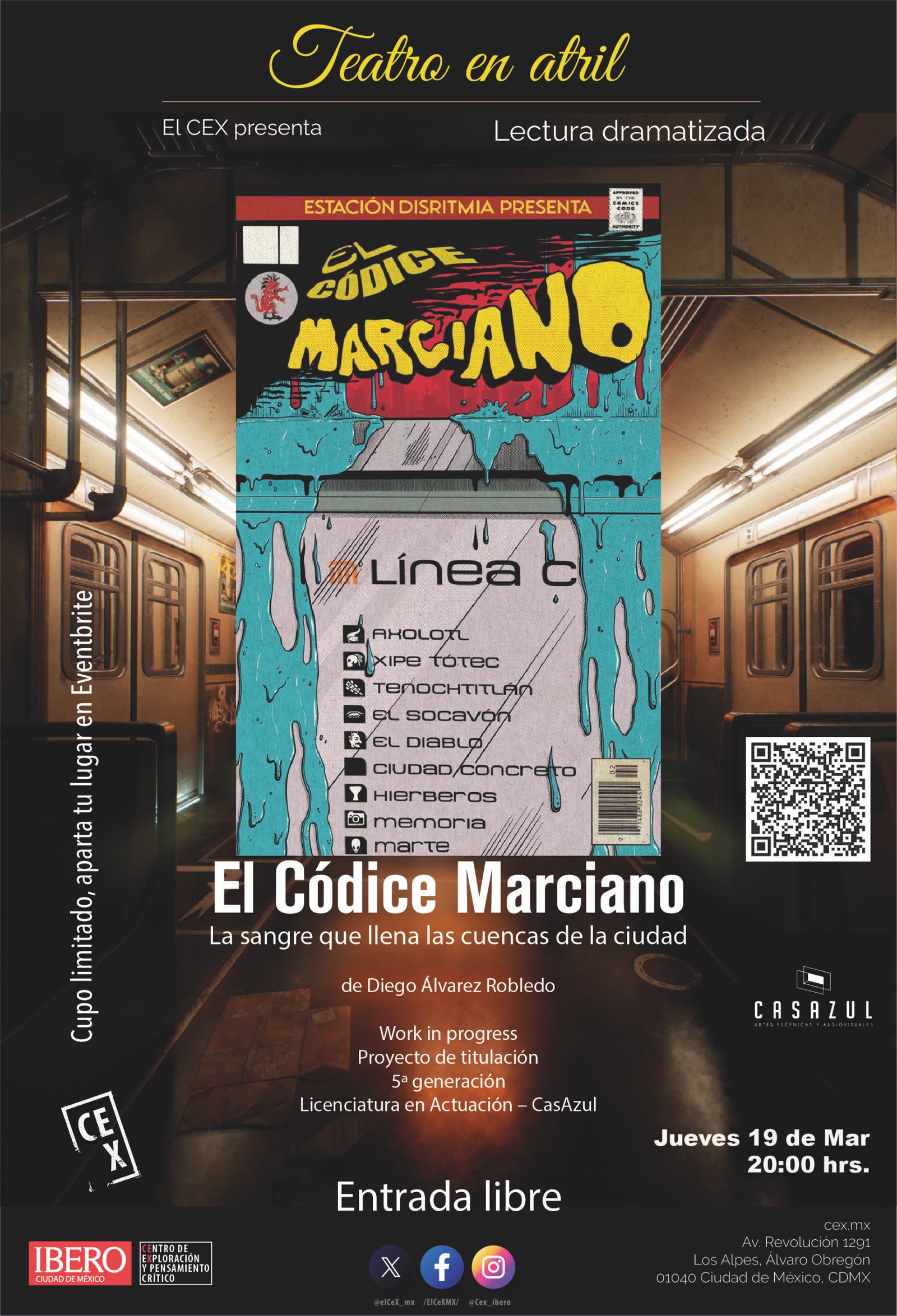 El Centro de Exploración y Pensamiento Crítico (CEX Ibero) presenta una lectura dramatizada a manera de work in progress de El Códice Marciano, un proyecto escénico que imagina la Ciudad de México como un territorio fantástico donde lo cotidiano convive con lo extraordinario.